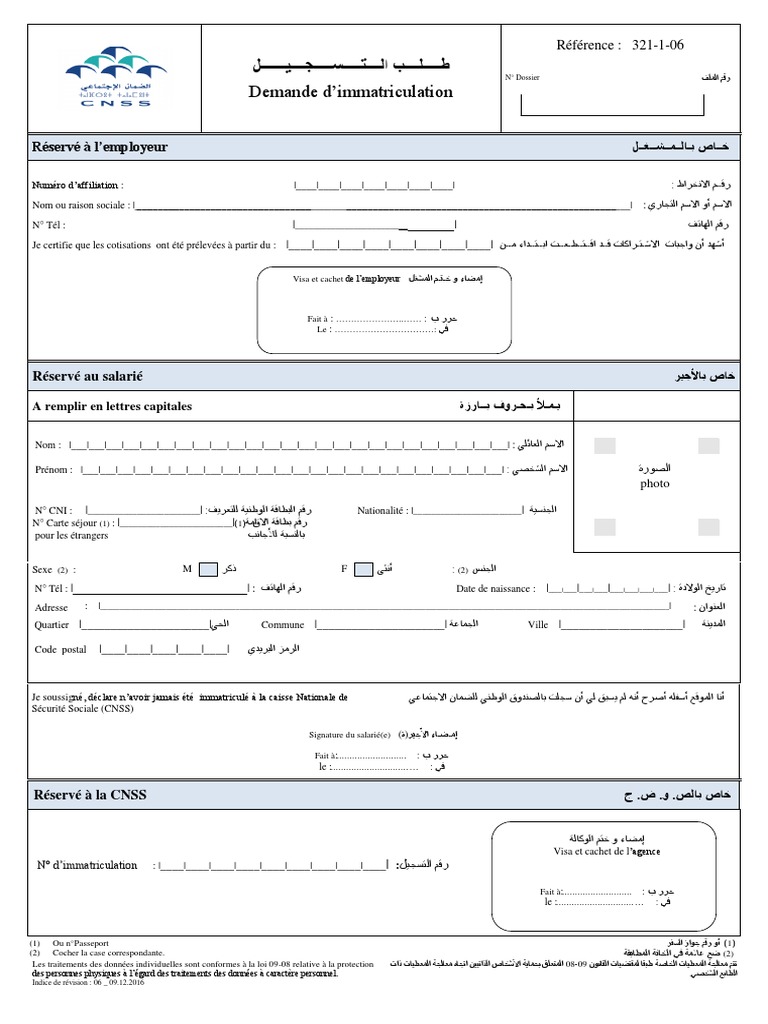 If you are looking for Demande D'immatriculation - Réf 321-1-06 - V06 - 09-12-2016 you've came to the right place. We have 6 Images about Demande D'immatriculation - Réf 321-1-06 - V06 - 09-12-2016 like طلب تسجيل عامل أجير 🖨️ - إدارتي, Demande D'immatriculation - Réf 321-1-06 - V06 - 09-12-2016 and also TÉLÉCHARGER FORMULAIRE CNSS MAROC GRATUITEMENT. Here it is: